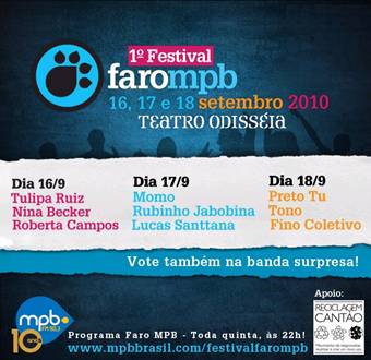 Começou ontem o 1º Festival Faro MPB no Teatro Odisséia. Apoiado pela Cantão, o Festival vai até o dia 18 de setembro e apresenta novos talentos da música brasileira. A marca carioca, que com seu espírito vanguardista já apoiou eventos como Rock in Rio I, show da Blitz, filmes, peças de teatro, grupos de dança e música, e o Palco Cantão, dessa vez criou um lounge no Festival todo decorado com tecidos do projeto Reciclagem Cantão, com pufes, tapetes e almofadas.