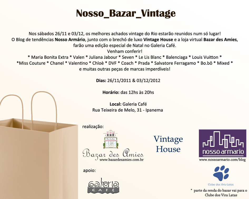 Nada melhor que um super bazar de peças incríveis pra gente fazer verdadeiros achados e ainda ajudar instituições, né? As amigas Julia Morales, do site www.nossoarmario.com.br, Ana Paula Fonseca e Renata Balbino (Bazar des Amies), e Alexia Wenk (Vintage House) se juntaram para organizar um bazar de final de ano em prol da ONG Clube dos Vira-Latas, que cuida de animais abandonados.