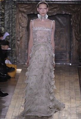 Givenchy: Riccardo Tisci anda pensando muito no Japão. Porém sua inspiração para os belos vestidos veio das vertentes pop e artística do país. Os toys viraram os chapéus de foguete by Philip Treacy, enquanto o bailarino Kazuo Ohno influenciou os longos brancos semi-transparentes, adornados com plumas e aplicações, com bordados em cores vivas (na frente e nas costas)que formavam desenhos de asas de pássaros, por exemplo.