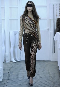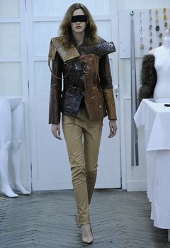 Maison Martin Margiela: o velho oeste, com botas e jaquetas em tons de bege ao marrom apareceu nas peças mencionadas e no belo trabalho de textura, com couro e peles de animais, num interessante patchwork. A calça skinny foi a base de todos os looks, que ainda incluiu uma blusa de tela e jaqueta em tiras.