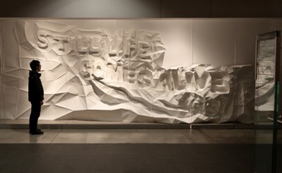 Essa arte é uma instalação tipográfica do diretor de criação Kyosuke Nishida. Não é legal e instigante? Intitulada “Still Life Comes Alive” é feita em pedaços de papel ligados um no outro, dando essa sensação 3D. Para conhecer mais de seu trabalho: http://www.kyosukenishida.com