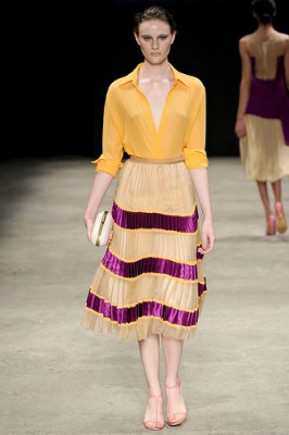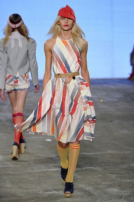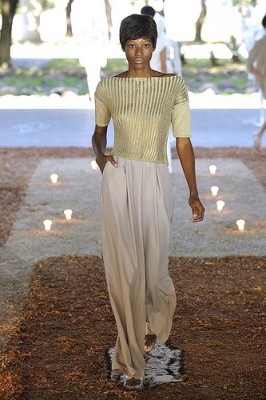Detalhes nas costas e muitos plissados devem funcionar bem para looks de festa, enquanto os acessórios estão mais “diurnos”, com muitas espadrilles, cintos de tressê, chapéus, viseiras e arranjos para os cabelos. Todos os itens são bem fáceis de vender, para deixar os empresários felizes, do jeito que o clima dos anos 70 pede…