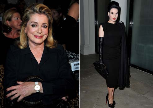 Ícones como Catherine Deneuve e Dita Von Teese esbanjaram elegância no look e na atitude, ao conferirem a coleção primavera-verão 2011 de Gaultier.