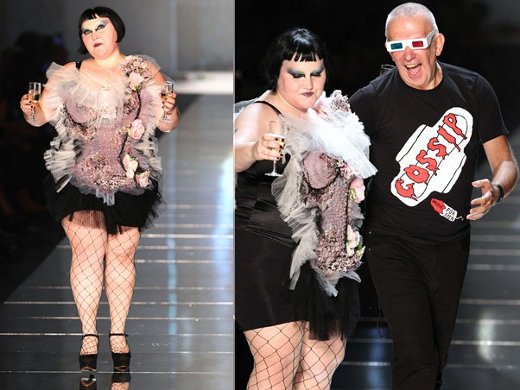 Sempre surpreendendo, Jean Paul Gaultier não fez diferente ao convidar a cantora do grupo de rock The Gossip, Beth Dito, que foi aplaudida de pé por sua ousadia e estilo.