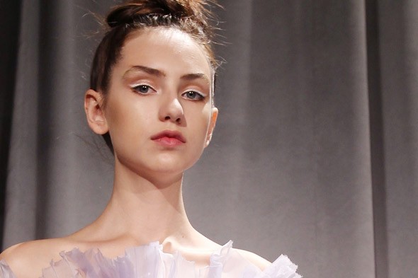 Com tema vintage-oriental em mente, a Marchesa criou uma maquiagem diferente, com olhos delineados de branco, sem blush e boca levemente rosada. Os cabelos ganharam um coque alto no meio da cabeça, com acessórios em pedraria na lateral. Pareciam verdadeiras bonecas de porcelana.