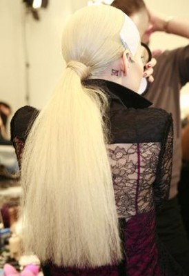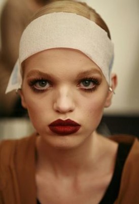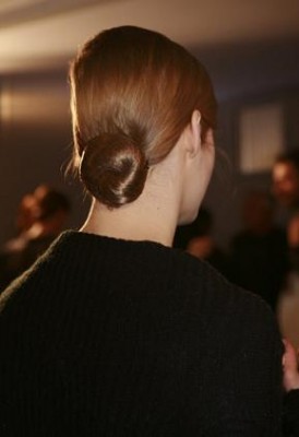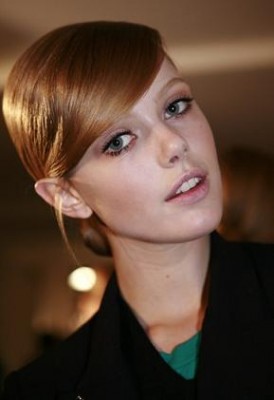 “Inspirada pela inocência da famosa Carnaby Street, em Londres” – foi como o hairstylist Guido Palau descreveu o cabelo, lateral e com coque baixo, usado no desfile de Alberta Ferretti. Seguindo o tema, a maquiadora Lucia Pieroni propõe olhos marcantes com cílios postiços, muito rímel e lábios nude. Um lápis de olho em tom café foi usado para complementar o make.