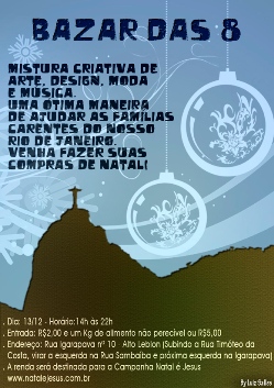 Novos nomes da moda, design, arte e música vão estar reunidos no Bazar das 8. O evento que acontece no dia 13 de dezembro, das 14h às 22h, terá sua renda destinada à Campanha Natal é Jesus (www.natalejesus.com.br). As marcas Chu Bikinis, Thais Leão, Rei do Rio e Objeto A marcarão presença e os que comparecerem terão opções de acessórios de prata, bolsas, doces e salgados. O espírito natalino será embalado pelo som lounge do DJ Gugga e exposições de design sustentável, fotografia e artes plásticas. Para ficar mais animado, a partir das 18h, várias novas bandas se apresentarão.