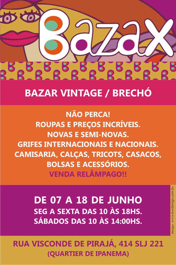 Começou hoje, dia 07, e vai até o dia 18 de junho mais uma edição do Bazax. O evento que acontece em Ipanema, reúne peças novas e semi-novas de grifes nacionais e internacionais, como Hermès, Chanel e Dior.