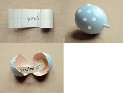 Primeiro você fura um ovo comum com uma agulha grossa e retire toda a gema, depois basta colorir com tinta como desejar! Escreva um recado em um pedaço de papel e enrole bem fininho, para colocar no furo do ovo. Por fim, dê de presente o seu Biscoito da Sorte de Páscoa! Simples de fazer, barato e fofo, além de criativo!