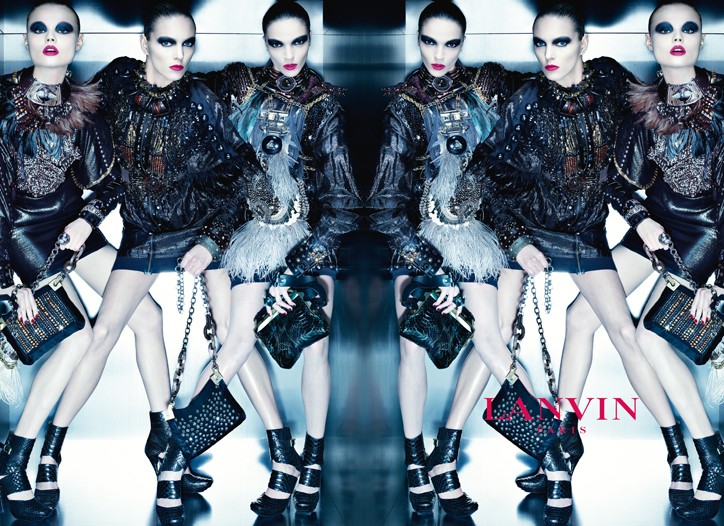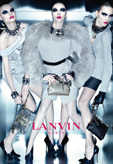Magdalena Frackowiak, Anja Rubik e Mariacarla Boscono se espremeram em caixas prateadas na nova campanha da Lanvin. As fotos são de Steven Meisel e começam a circular nas revistas femininas de agosto. Diferentemente de campanhas anteriores, desta vez as imagens são mais maximalistas e intensas, com muito preto e cinza, além de vários acessórios e maquiagem pesada.