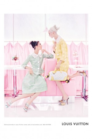 Já na Louis Vuitton, Steven Meisel reforça a tendência de colocar new faces em grandes campanhas (adeus celebridades e tops?). Ele e Marc Jacobs escolheram Daria Strokous e Kati Nescher para posar no que seria uma confeitaria, com muitos doces e sorvetes em volta, reforçando o tom açucarado do desfile que tinha um carrossel na passarela, lembram? Fofo, não?