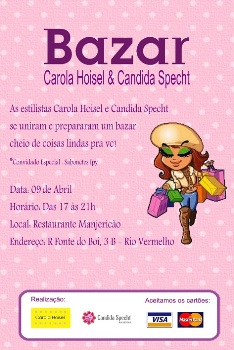 Amanhã (09/04) acontecerá um Bazar organizado pelas estilistas baianas, Carola Hoisel e Candida Specht, no restaurante Manjericão, no Rio Vermelho (BA). A proposta de queima do estoque da coleção verão 2011, traz peças com até 50% de desconto. O evento acontece das 17h às 21h e é aberto ao público. Para conhecer os trabalhos das estilistas, acesse os blogs http://www.carolahoisel.blogspot.com/ e http://candyatelier.blogspot.com/.