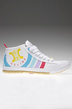 Celine nos Pés By 2009-05-18Sem categoria Phoebe Philo ainda não lançou sua primeira coleção pela Celine, mas já fechou uma parceira com a grife chinesa Feiyue para criar este tênis aí da foto, todo retrô e colorido.