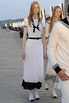 A silhueta é alongada, com toques navy nas blusas e vestidos pelos tornozelos. Mas o drama está na essência da cidade e por isso mesmo estavam lá os bordados, as rendas e as capas pretas usadas com chapéus tricórnio que abriram o desfile. A cartela era praticamente neutra, com muito branco, marinho, vermelho, cinza e tons de dourado. Destaque para a beleza, com cabelos curtos e ondulados e olhos bem marcados, como Coco usaria nos dias de hoje! Veja mais em www.chanel.com
