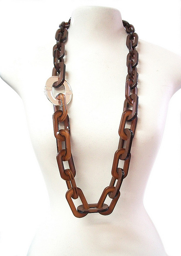 Os colares de correntes são ótimos pra levantar qualquer look: grandes, curtas, grossas e finas, sozinhas ou várias usadas ao mesmo tempo. Seguindo a tendência do correntismo, a designer italiana Francesca Romana Diana desenvolveu o colar ‘Holly Elos’, peça best seller da coleção ‘Optical Illusion’. É uma corrente de celulóide disponível em nove diferentes cores com exclusivo fecho de metal banhado em ouro ou prata. Puro luxo!
