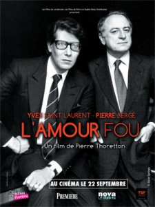 O documentário “L’Amour Fou” (“Amor Louco”), com direção de Pierre Thoretton, que esteve na programação da 33º Mostra Internacional de Cinema de São Paulo em outubro e no Festival de Cinema do Rio, sobre a vida e trajetória de Yves Saint Laurent, vai ser relançado no Brasil em 2011. Produzido após a morte de Yves Saint Laurent o filme mostra os preparativos do que ficou conhecido como “Leilão do Século”, a venda do acervo e das coleções de artes e antiguidades de YSL com seu companheiro Pierre Bergé. O filme também retrata as diversas coleções do estilista que é considerado o pai do prêt-à-porter. Yves Saint Laurent criou o smoking feminino, explorou a moda étnica africana, asiática e russa muito antes do multiculturalismo.