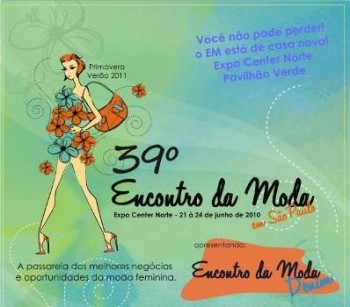 Acontece entre os dias 21 e 24 de junho, no Pavilhão Verde do Expo Center Norte, a 39ª edição do Encontro da Moda. Aberto a lojistas e profissionais do setor têxtil e de confecção, o evento responsável por abastecer as vitrines de todo Brasil, apresentará os lançamentos do verão 2011 de oito estados brasileiros.