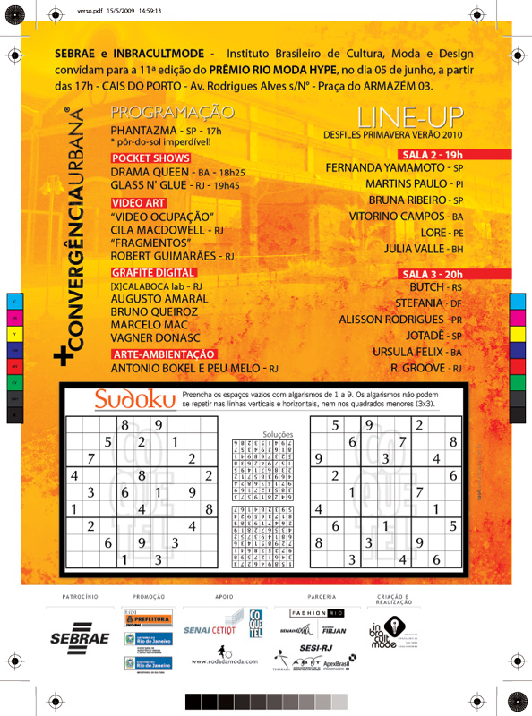 Mais uma vez, o passatempo preferido do público antes do PHMH começar, é garantido com as Revistas Coquetel, da Ediouro. Serão 3.200 exemplares para a platéia, além de 400 nécessaires com 4 Coquetel, caneta e um exemplar do livro “A Vida Secreta dos Grandes Autores”, dentro das bolsas do SEBRAE distribuídas para os jornalistas de moda.