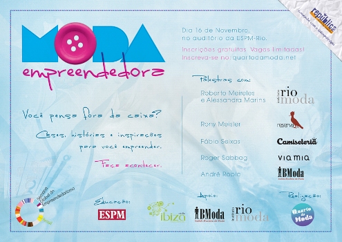 No próximo dia 16 de novembro, às 19h, a República – agência formada através do Núcleo de Empreendedorismo da ESPM-RJ – realiza o evento Moda Empreendedora. O mesmo está sendo organizado pela plataforma de moda universitária desenvolvida pela agência – o “Quarto da Moda” – que gera conteúdo, pesquisa e aponta tendências para jovens e empresas do segmento. O encontro faz parte da Semana Global de Empreendedorismo 2010 e tem como objetivo motivar, espalhar e integrar negócios de sucesso ligados ao universo da moda, além de apresentar histórias, cases, oportunidades e lições para jovens empreendedores interessados no segmento. Os convidados serão: Roberto Meireles e Alessandra Marins, do Instituto Rio Moda; Rony Meisler, da Reserva; Fábio Seixas, do Camiseteria; Roger Sabbag, da Via Mia e André Robic, do Instituto Brasileiro de Moda (IBmoda), e a mediadora da mesa será Ana Lavaquial, sócia da consultoria Pimenta Marketing Total, consultora do Instituto Rio Moda e professora de graduação da ESPM-RJ.
