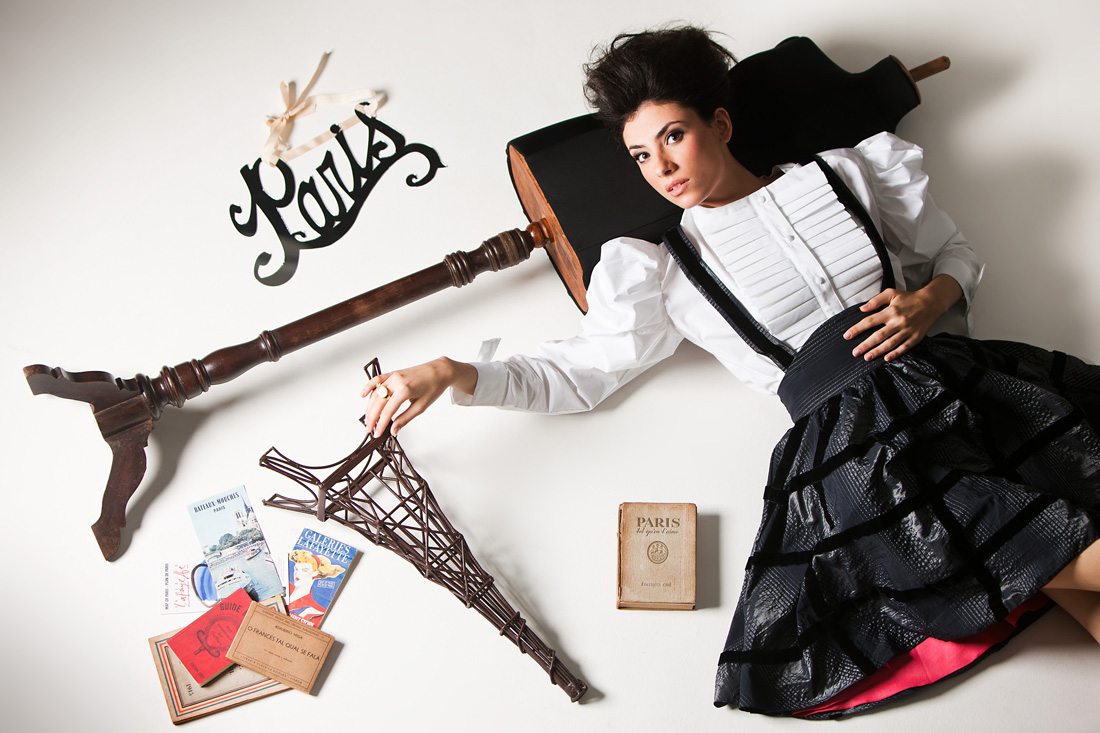 Os padrões estão dividos por temas – florais com laços, estampas à mão livre; e os clássicos, pied-de-poule e xadrez estilizados. Entre os tecidos, cetim e organza de seda. Os acessórios eram sapatos oxford e scarpin com salto grosso enquanto a bolsa com formato de câmera fotográfica continua sendo a aposta da marca. Outros elementos que são referências de Paris viraram acessórios como: o pingente Torre Eifell e o “Oui”.