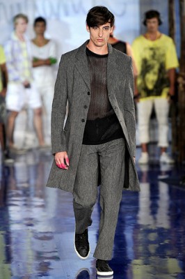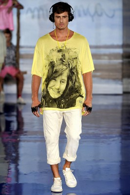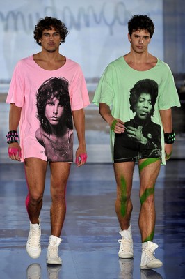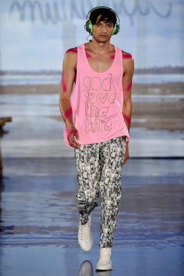 O último desfile do Senac Rio Fashion Business foi da grife masculina Addict, que estreou nas passarelas com um mix esportivo e urbano, com fortes referências às cores dos anos 80. O tema girou em torno da música e de seus ídolos, com camisetas com frases do tipo “God save the king” e silks com os rostos de mitos como Janis Joplin e Jim Morrison. Na modelagem, muitas bermudas, camisetas de malha fina e algumas peças de alfaiataria no final. A cartela era bem afinada com tons sorvete (rosa, azul, amarelo, verde), preto, cinza e branco, além de muitas estampas do tipo grafite e listras.