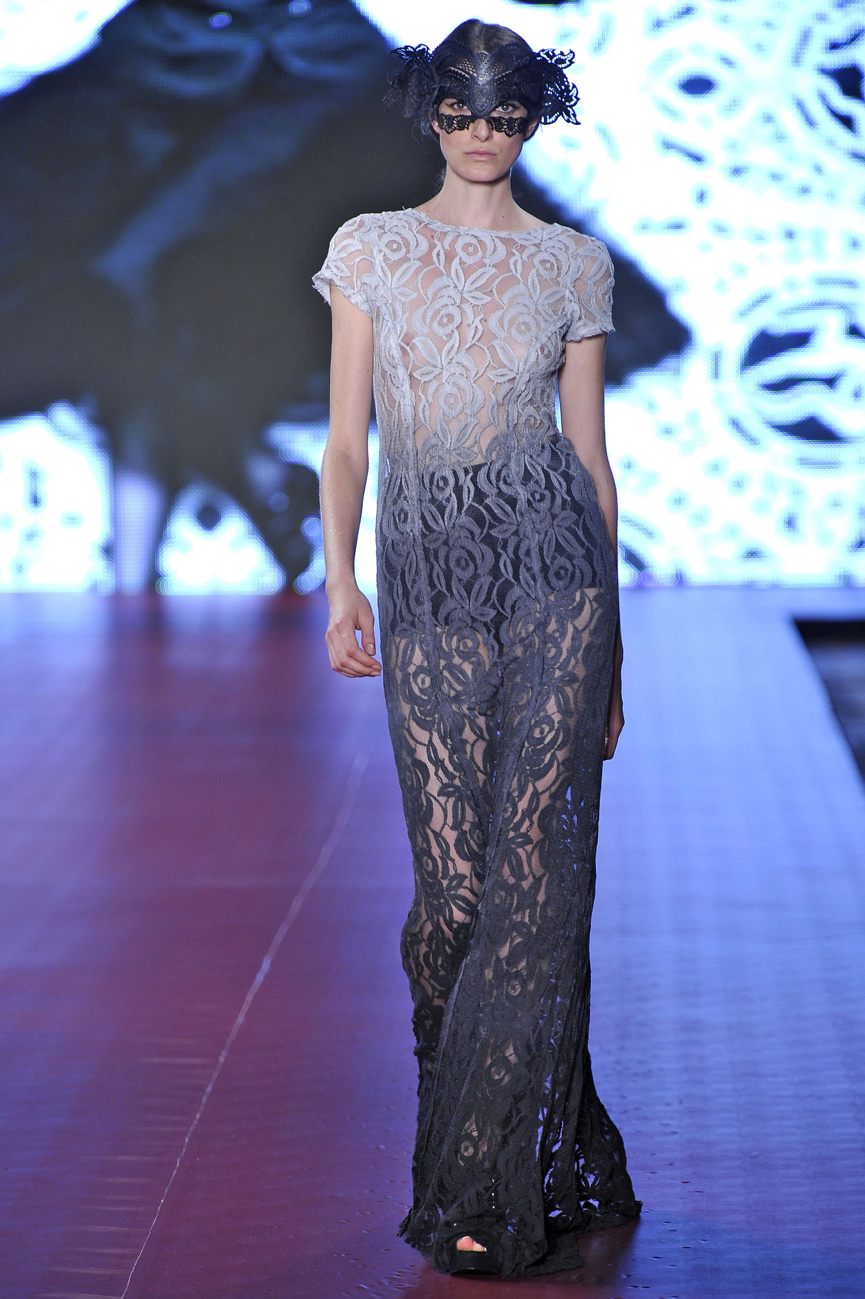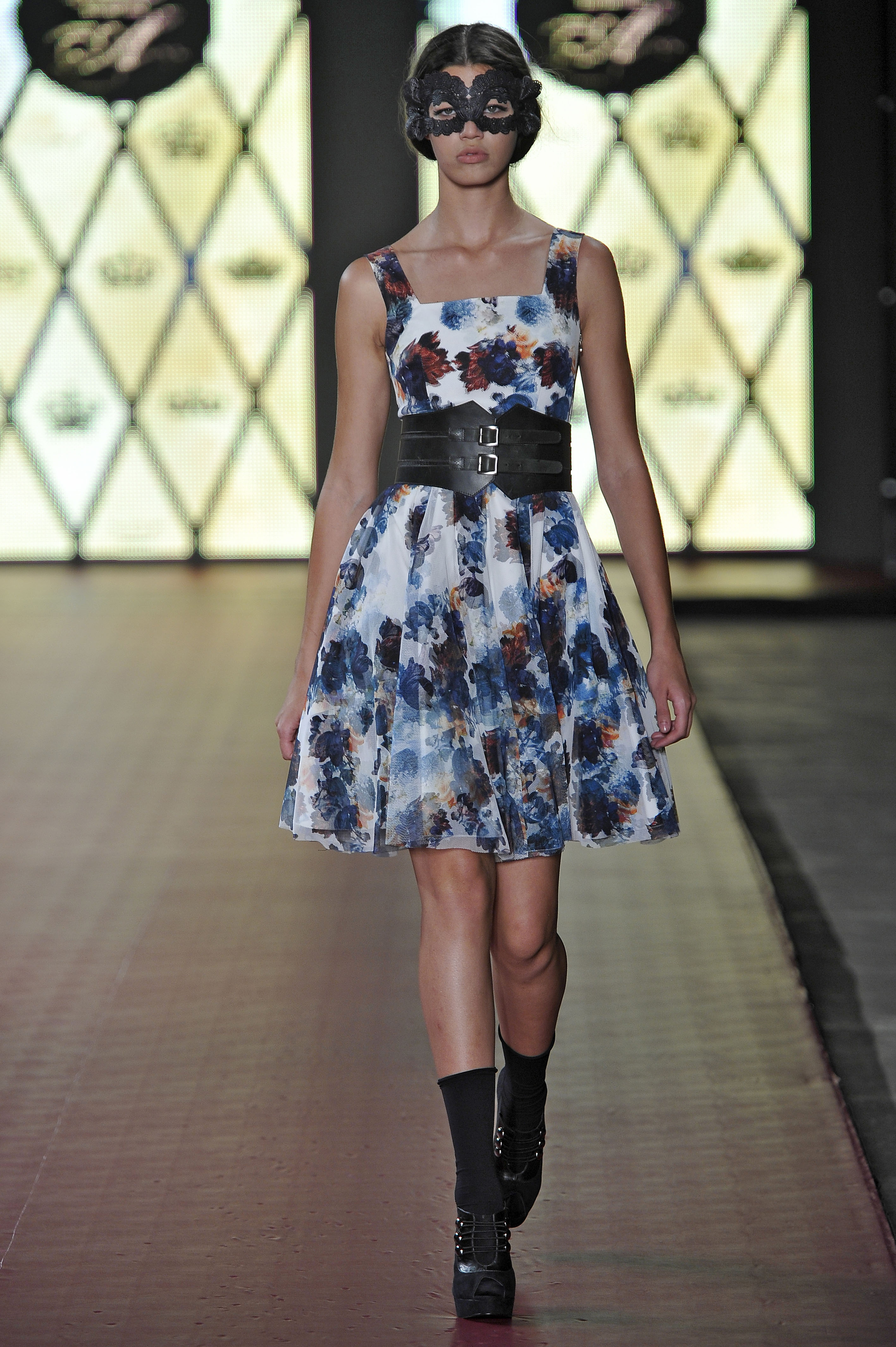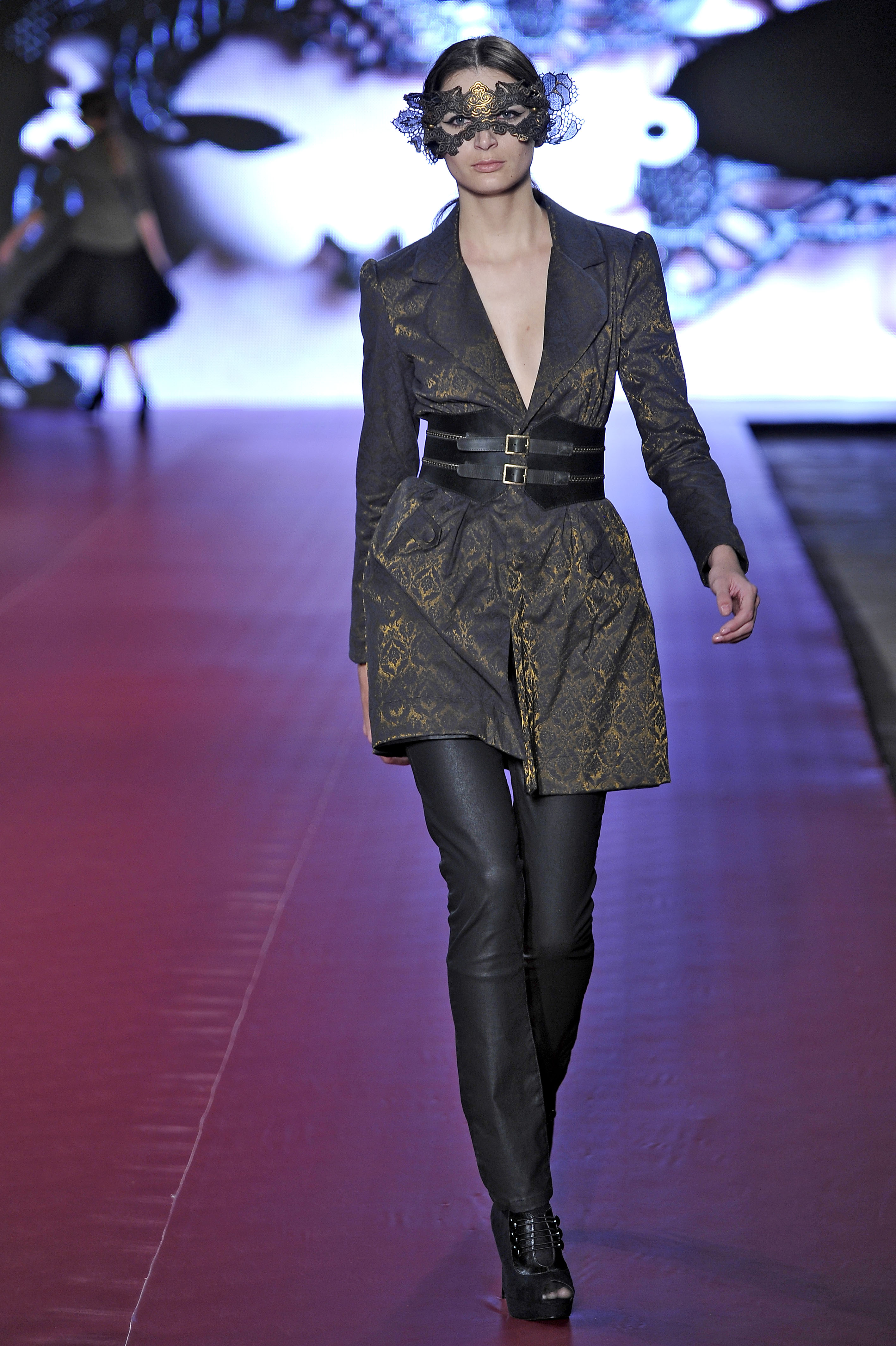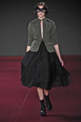 Em seu segundo desfile no Fashion Business, a Afghan demonstrou maturidade e uma identidade cada vez mais fortalecida. O tema do inverno é baile de máscaras, uma livre inspiração na corte e no barroco, com muita renda, brocados, tule e tons escuros. O militar e a silhueta dos anos 50 também foram marcantes na coleção, que começou mostrando casacos e calças de alfaiataria – com skinny cargo e skinny sarouel. A cintura veio marcada com cintos grossos, realçada por saias godês ou de comprimento nos joelhos. O decote tomara-que-caia apareceu nos corselets – marca registrada da grife – em looks de ouro velho com brilho discreto. Já as estampas vieram abstratas e em 3D, técnica que a marca já explora muito bem. Outro ponto alto eram os looks em degradê de cinza, em rendas e veludo devorée, causando um efeito moderno e sofisticado.