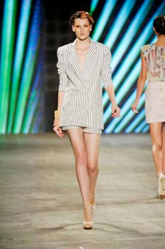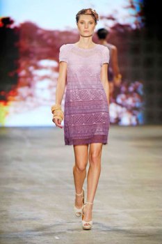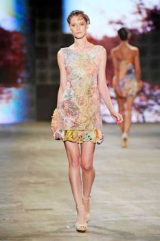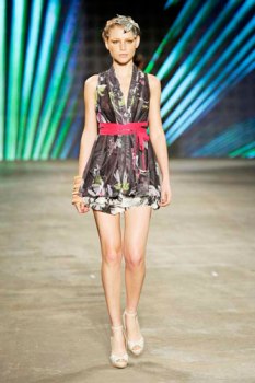 Vestidos coquetel em degradê lilás, com aplicações e pequenas faixinhas uniam rusticidade e romantismo. No final, peças listradas, inclusive um blazer alongado, apareceram em modelagens assimétricas de 1 ombro só, além de mais estampas florais, desta vez escuras, ou em preto e branco, e com pequenas inserções de rendas, deram o tom feminino da coleção.