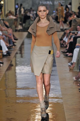 Hoje pela manhã a Mara Mac desfilou no Fashion Business sua coleção outono/inverno 2011, no Copacabana Palace. “Minimalismo Rural” é a nova aposta da grife para o próxima estação. Um mix de rusticidade com modernidade. Com formas definidas, corseletes acinturados tomaram conta da passarela, além de peças com ombros destacados. Forte presença de tricôs e diversidade nos padrões de tweeds de lã. Na cartela de cores, tons naturais como o caramelo, cinza e bege. Destaque para os acessórios assinados pelo stylist Rogério S, porta iPads e sapatos com bico navio, dando o toque final aos looks.
