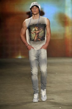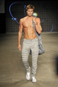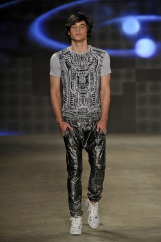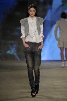Marcello Iabrude estreou nas passarelas do Rio Moda Hype há alguns anos e agora faz vôo solo no Fashion Business. Batizada de “Intergalactic, the birth of homo spaciens”, o desfile começou com uma projeção animada sobre o espaço. E assim veio a coleção cheia de referências futuristas e uma cartela de cores que trazia branco, gelo, cinza, metal, preto, limão e índigo. O jeans é a grande estrela da marca e veio com lavagens bem claras, em bio-mofo e resinas cozidas. As femininas têm um toque boyfriend enquanto as masculinas são de cintura baixa. Detalhes de matelassados nas calças reforçaram a mensagem intergaláctica. A marca tem potencial!