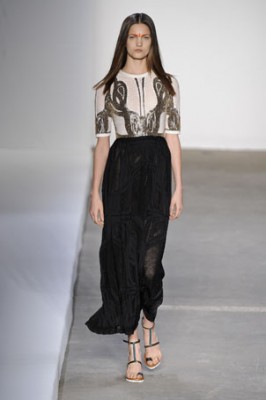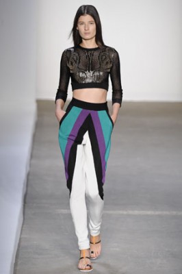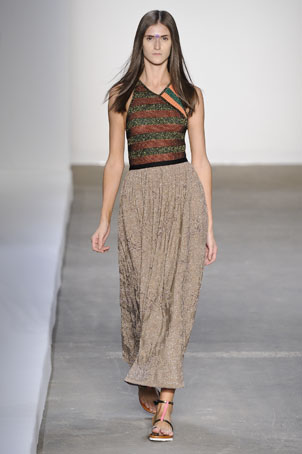 A silhueta era bem ajustada, com peças elásticas, e a cintura era elevada, deixando o estômago à mostra. Saias e vestidos longos alternaram-se a comprimentos curtos, enquanto as camisetas tinham recortes nadador e as blusas mangas coladas aos braços. As listras coloridas no lurex foram um dos grandes momentos, assim como os desenhos de tigres em cores contrastantes. Ver uma coleção tão autoral assim nos dá um frescor incrível…