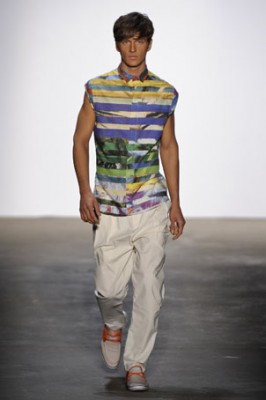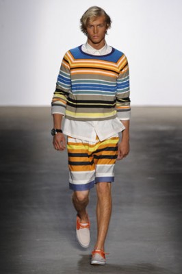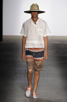 Na cartela, muitos tons fortes, sobretudo nas listras que estavam em quase todos os looks. Muito interessante o trabalho da estamparia, unindo fotos digitais às tiras. Engraçadinho também foi o chapéu de palha… Nos pés, docksiders Converse, caminhando, literalmente, para serem cool.