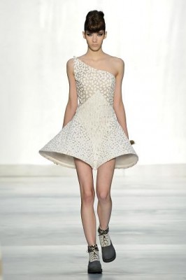 Com inspiração na fragilidade da natureza humana, a Acquastudio abriu o dia desfiles do Fashion Rio e mostrou sua encantadora coleção, com um incrível trabalho de tramas, bordados e pespontos. Com modelagens bem femininas e silhuetas bem marcadas, criando peças de formas inusutadas, a grife manteve sua identidade, mostrando inovação. A cartela de cores foi composta por cores que reinará na próxima estação: gelo, caml, grafite e preto. Destaque para os acessórios, em especial o mocassim, confeccionado em lã e com tecidos de teares, os mesmos da coleção.