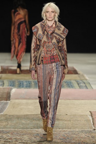 A marca carioca Alessa apresentou uma coleção de inverno inspirada nas estampas étnicas dos tapetes persas. Batizada de “Céu na Terra”, a coleção trouxe calças, vestidos e macacões em modelagens amplas e fluidas, em tecidos como a seda, assim como peças de alfaiataria (blazers, casacos e calças) em tecidos mais encorpados como tricô, jacquard e lã.