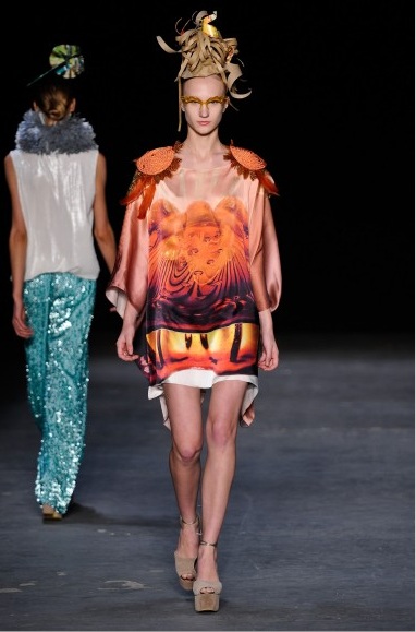 Para complementar o visual, acessórios exoticos e nada discretos apareceram repletos de referências sessentistas. Nos pés, saltos altos de camurça nas cores cáqui e preta.