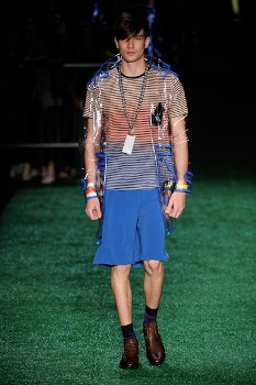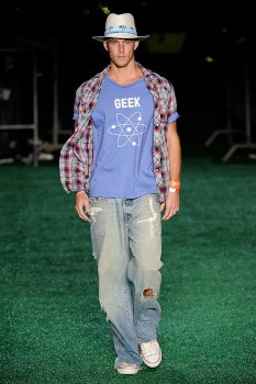 Sabe aquelas fotos incríveis que a gente vê das pessoas que vão aos festivais de Coachella, Glastonbury, Lollapalooza? Este foi o clima e, claro, a inspiração para o verão da Auslander, reforçado pelo show ao vivo da banda Dragonette. Vamos às roupas: anos 80 e 70 se encontram nos looks despojados, que reúnem peças bondage, camisetas amplas com frases engraçadinhas, leggings, skinnies (principalmente para os homens), jeans super lavados, detonados e desfiados, com desenhos “pichados”, macacões e camisas xadrezes, além de florais, faixas na cabeça, penas como boleros, chapeuzinhos e muitos tênis, além de uma capa de plástico, em caso de chuva!