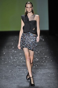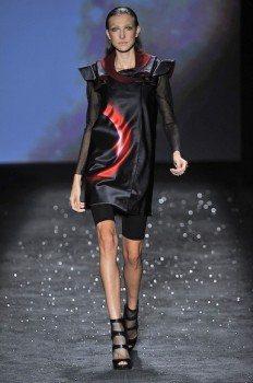 Só que neste desfile de outono/inverno, alguma coisa desandou. Talvez pela amplidão do tema, que falava sobre destino, tempo e espaço, mas se traduziu mesmo em looks “interplanetários”, talvez por alguns já terem sido trabalhados por outras marcas (ombros destacados, vestidos coquetel com detalhes nos quadris, brilhos, estampas do céu noturno…). O fato é que o desfile começou morno, com calças skinny e bermudas ciclistas (algumas de tela) usadas com blusas e jaquetas volumosas, que lembravam figurinos de “Guerra nas Estrelas” e filmes do gênero, couro, azul jeans e preto e só empolgou no final, quando entraram os tons de amarelo ao roxo passando pelos vermelhos e vinhos, num bonito degradê, estampas do tipo HQ de naves no espaço, de eclipses e de planetas, alguns bandage dresses e vestidos de cetim com babados no torso. Outro problema foi a modelagem das peças, que “engordou” até as modelos! Mesmo assim, se as adaptações comerciais forem bem-feitas na hora da coleção ir para as lojas, é quase certo que o sucesso das vendas esteja garantido!
