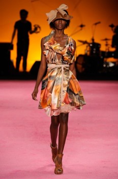A silhueta foi a maior surpresa, com saias rodadas, totalmente anos 50, e volumes extras, dados pelos patchworks de tecidos, anáguas e aplicações que formavam repuxados, laços dobrados e pregas. A influência boudoir também veio forte, com vários corseletes, sutiãs e calcinhas. Macaquinhos e calça de cintura alta estampada completaram os looks. Os tecidos se revezavam entre os leves como algodão, seda, organza e lurex e os mais estruturados: jeans cortado a laser, jacquard, crochê e malhas com acabamento especial.