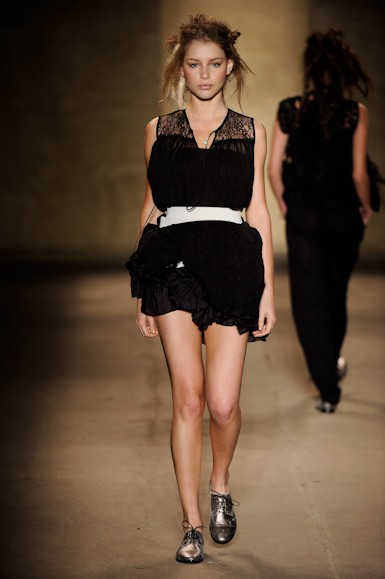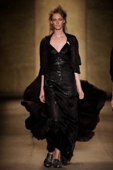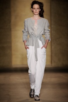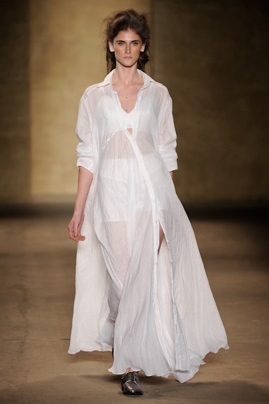 Ao som de uma ventania começou o penúltimo desfile do dia. Uma das inspirações de Graça Ottoni para a próxima temporada, o filme “Casa de Areia” foi transportado para a passarela em vestidos, calças pantalonas amarradas com laços na cintura e pregueadas, blazers, saias compridas, bermudas dobradas na barra e coletes. Destaques para o brilho que pontuava as peças da coleção, assim como os looks trabalhados em renda, as transparências e os bordados de richelieu que lembravam enxovais antigos. As cores gelo e prata evocavam nuvens e ondas, e o preto, que a partir de um certo momento dominou o desfile, era contrabalançado pelo branco. Para conseguir um resultado leve, pensando nos trópicos, a estilista lançou mão de tecidos de fibras naturais, como o algodão, o linho e a seda , e a malha – sempre confortável. Destaque para os volumes formados por amarrações e para o último look, um vestido preto brilhoso, simplesmente lindo, acompanhado por um sobretudo de tecido transparente esvoaçante.