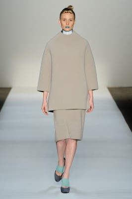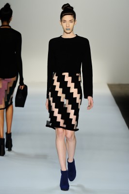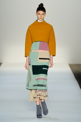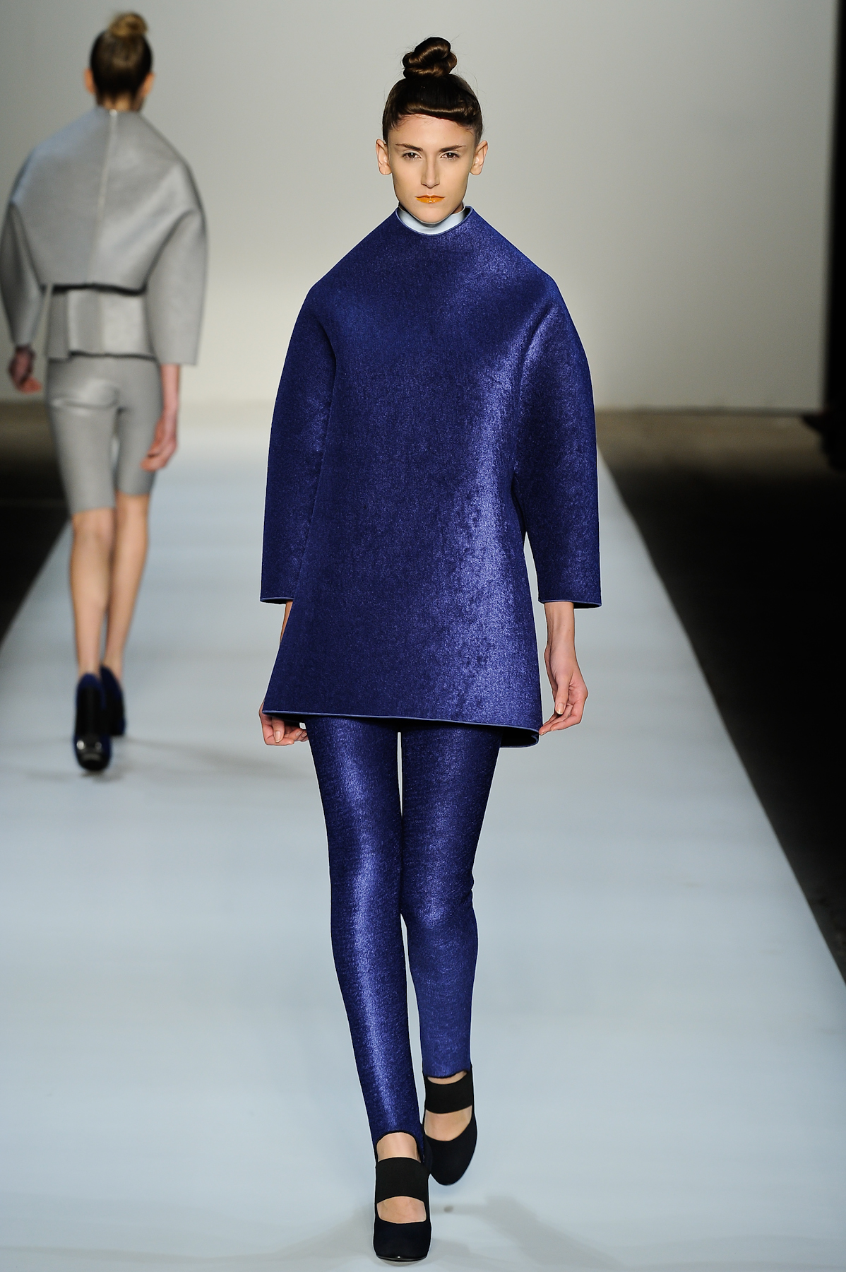 As blusas de mangas compridas curtas e sem cavas apareceram em muitos looks, numa modelagem do tipo “cocoon”, contrastando com a parte inferior mais ajustada, em saias retas com fendas, bermudas ciclista ou leggings. O grande destaque vai para a técnica da intarsia, uma combinação de fios brasileiros e europeus, traduzido em oposições de peso x leveza. Na prática, recortes de tecido transparente em tricôs com desenhos geométricos em cinza, lilás, azul, verde e preto. Lindo o último look em azul irisado! Nos pés, ankle boots de Klaus Jurgen Schmidt, nas mãos as bolsas estilo “box-marmita” de operário e no pescoço, joias de Fernando Jorge.