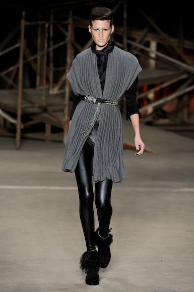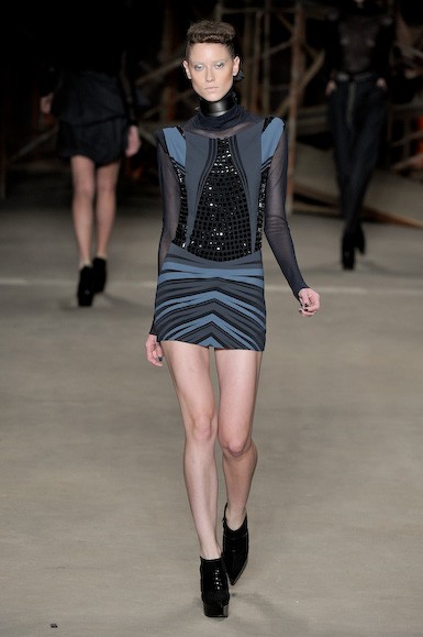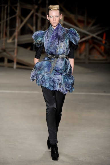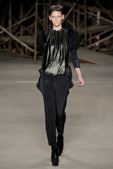 Apesar do trabalho dos tecidos ser muito bom, as formas patinaram entre o que já foi (muito visto) nesta semana: vestidos curtos – aqui excessivamente até – com ombros destacados, ankle boots e cuissardes, volumes localizados e brilhos. A parte final foi mais suave com uma estampa de “pingos” em tons de verde ao roxo, além de um vestido em camadas. Resta saber se as consumidoras ainda estão dispostas a se vestirem como guerreiras…