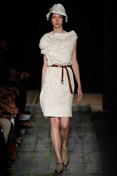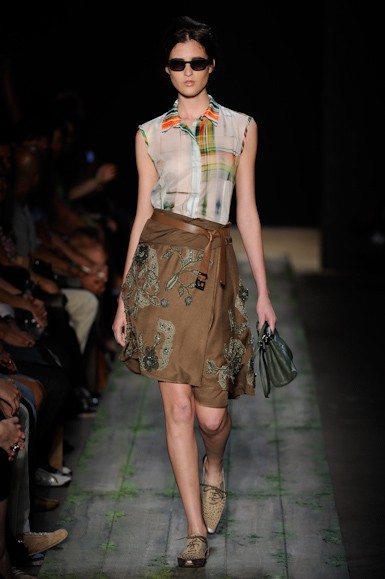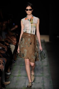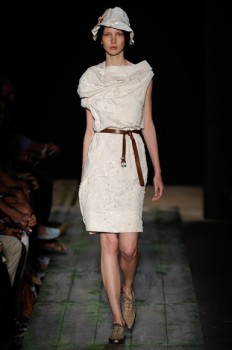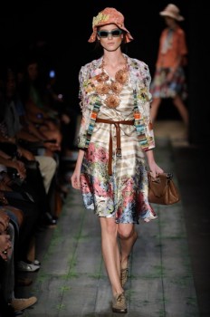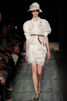 Depois foi a vez do amarelo vivo aparecer com o mix xadrez + floral nas peças construídas sob moulages, feitas de tecidos sobrepostos. As flores também apareceram em saias de seda, reforçando a inspiração do desfile. Blusas e jaquetas de mangas fofas remetiam ao clássico trench. Entre os acessórios, chapeuzinhos de tecidos, óculos de armações coloridas, sapatos oxfords, carteiras com alças e broches metálicos. Alguns looks das mini-ladies excêntricas da Printing lembravam bastante as coleções de Sir Paul Smith, um legítimo representante dos jardins ingleses!