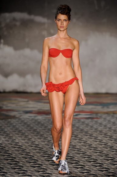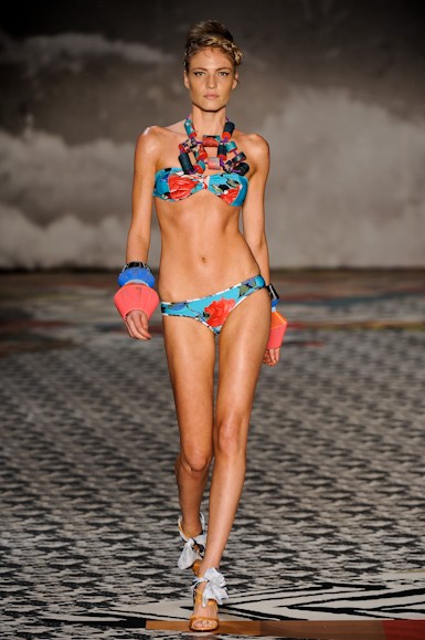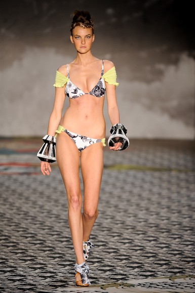 Biquínis com babados nos ombros e nas laterais das calcinhas, flores em preto e branco e nós largos como fechos apareceram com pulseiras e colares enormes. Tons flúor de laranja e amarelo limão, estampas florais com fundo turquesa, de rosas e coqueiros completaram a coleção.