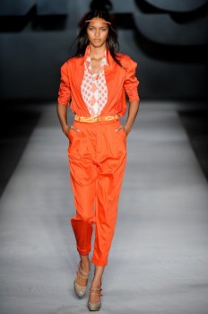 Na cartela, goiaba, laranja, rosa, preto e branco. O denim veio azul claríssimo, porém no final, alguns looks em azul escuro não fizeram feio. Nos acessórios, cintos de tressê marcando a cintura, gravatinhas para os meninos e meninas (usadas sobre chemises e mini vestidos) e sapatos boneca de duas tiras com meias pink. Ah, a celebridade que fez par com Carolina foi Marcello Antony…