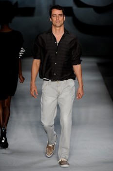 As estampas geométricas, em listras, quadrados, bolas e losangos foram a parte mais marcante do desfile, que começou com macacão e jeans capri, de barra virada, usado com camisa bicolor. Os shorts, como o de Carolina Dieckmann, apareceram bastante e tinham boa modelagem. As camisas, bem anos 80, eram mais folgadas e cavadas. Camisetas com volume nas costas (hit da estação), também marcaram presença, assim como jeans quase baggy, com pregas frontais. Os com gancho baixo e o boyfriend também pontuaram a coleção. Toques mais esportivos ficaram por conta do macacão masculino com capuz.