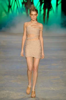 A assimetria marcou a modelagem: decote 1 ombro, vazados e recortes em lugares estratégicos estavam em praticamente todas as peças. Selvagem mesmo foi a micro saia com rasgos laterais, que fez a modelo puxar a barra várias vezes…