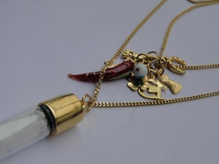 Colares com amuletos da sorte e vidrinho de sal grosso – Maria Bijufina – a coleção completa está no Facebook da marca