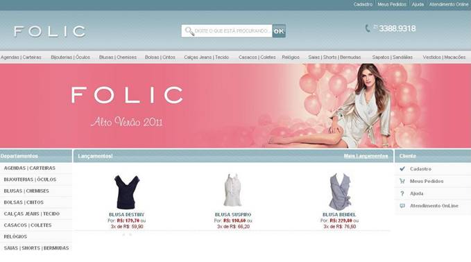 A Folic entrou na onda do e-commerce, que facilita a vida de quem está sempre correndo e aproxima consumidores de todos os cantos do Brasil, lançando seu site de compras pela internet. Na loja virtual, estão as principais peças da coleção verão 2011, entre vestidos, blusas, sapatos e bolsas. Inez Oliveira, gerente de e-commerce afirma que a expectativa é que a loja virtual represente ainda no primeiro semestre de 2011 o faturamento médio das lojas físicas. Confira em: http://lojavirtual.folic.com.br