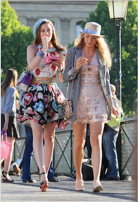 Tudo indica que a viagem de Serena e Blair para Paris vai render bons capítulos na quarta temporada de Gossip Girl. Algumas imagens das duas perambulando pela capital francesa vazaram na internet. Não resisti quando vi esses looks. Que vontade de passar o verão em Paris, vestida assim….