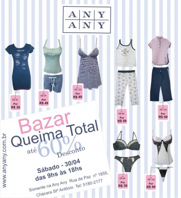 A grife Any Any, promove neste sábado (30/04), uma queima total de peças de coleções anteriores. São roupas íntimas femininas com descontos de até 60%.