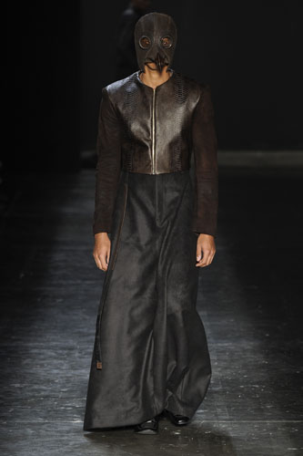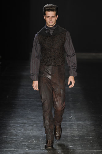João Pimenta: uma das únicas marcas masculinas do evento, o estilista está mais interessado em criar roupas-figurino do que propostas de moda. As peças remetem aos séculos XVII e XIX, com volumes nas basques, tons escuros, texturas, calças de prega ou gancho baixo e nenhuma conexão com a contemporaneidade.